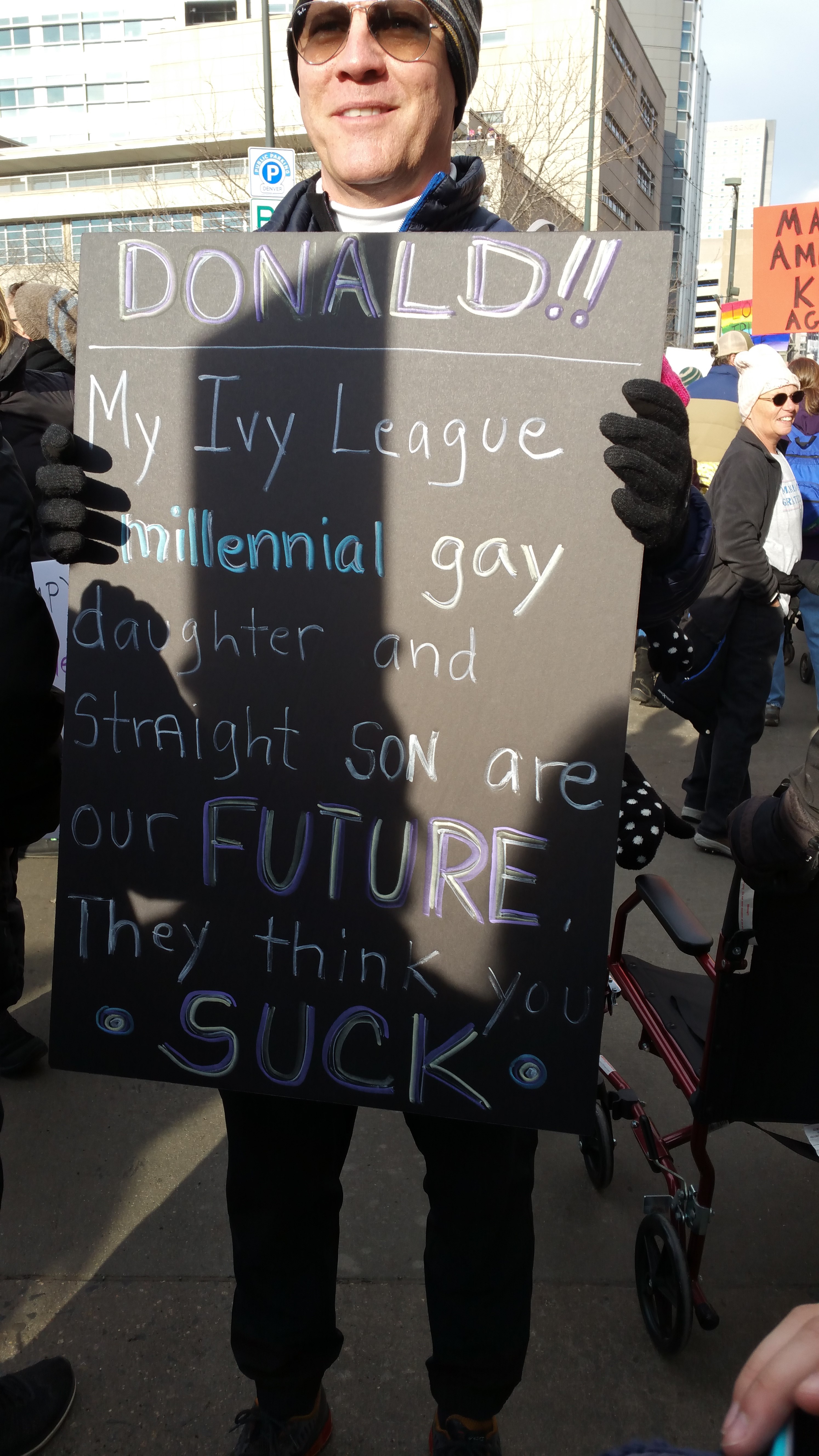 Picture of a father carrying a sign that says, "Donald!! My Ivy League millennial gay daughter and straight son are our FUTURE. The thin you "SUCK."
