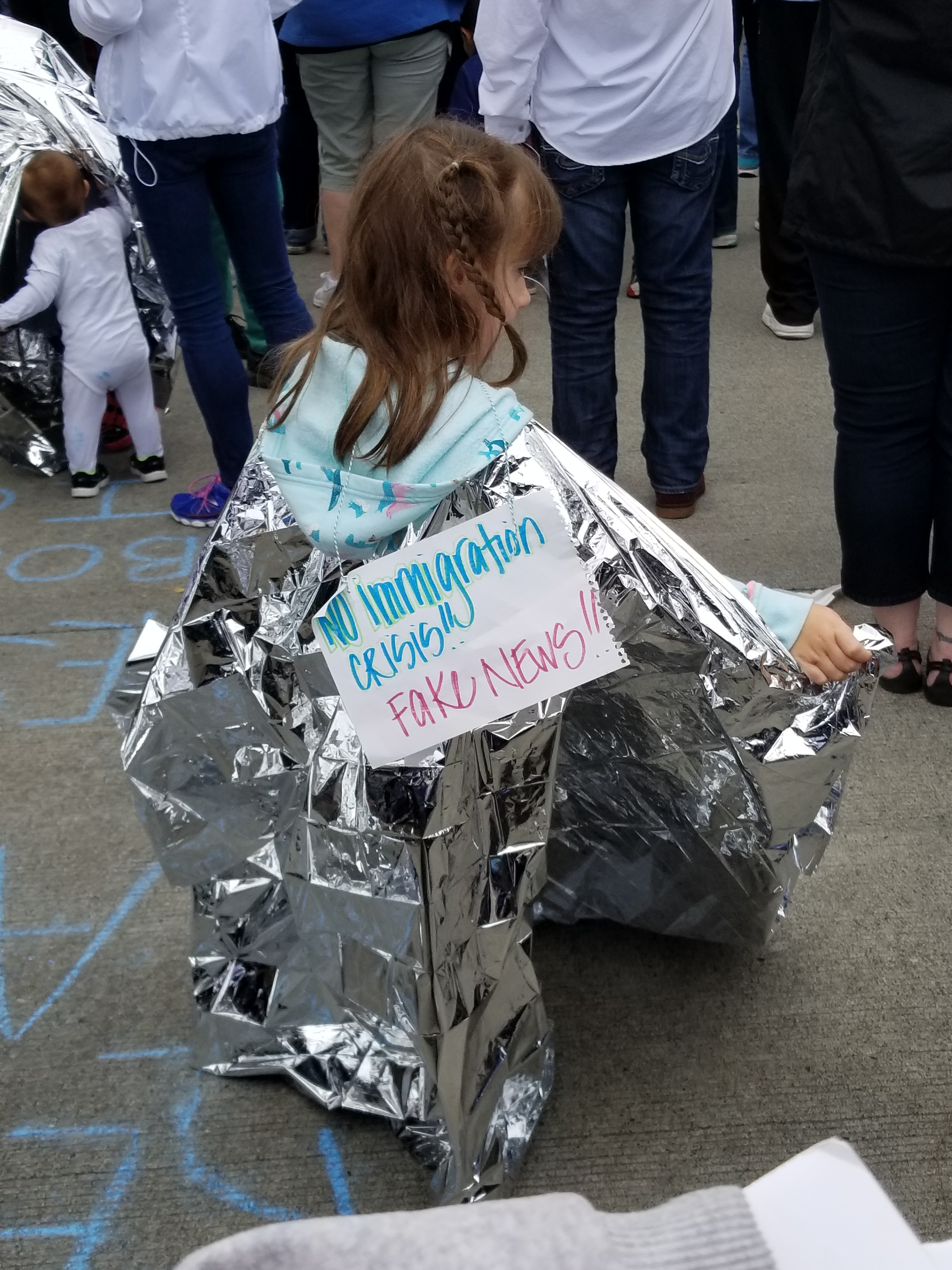 picture of a child wearing aluminum foil with a sign saying that the statement “Fake News! No Immigration Crisis!”