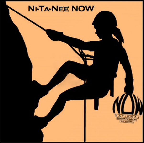 Ni-Ta-Nee NOW logo of a woman successfully scaling Nittany Mountain and working for equality