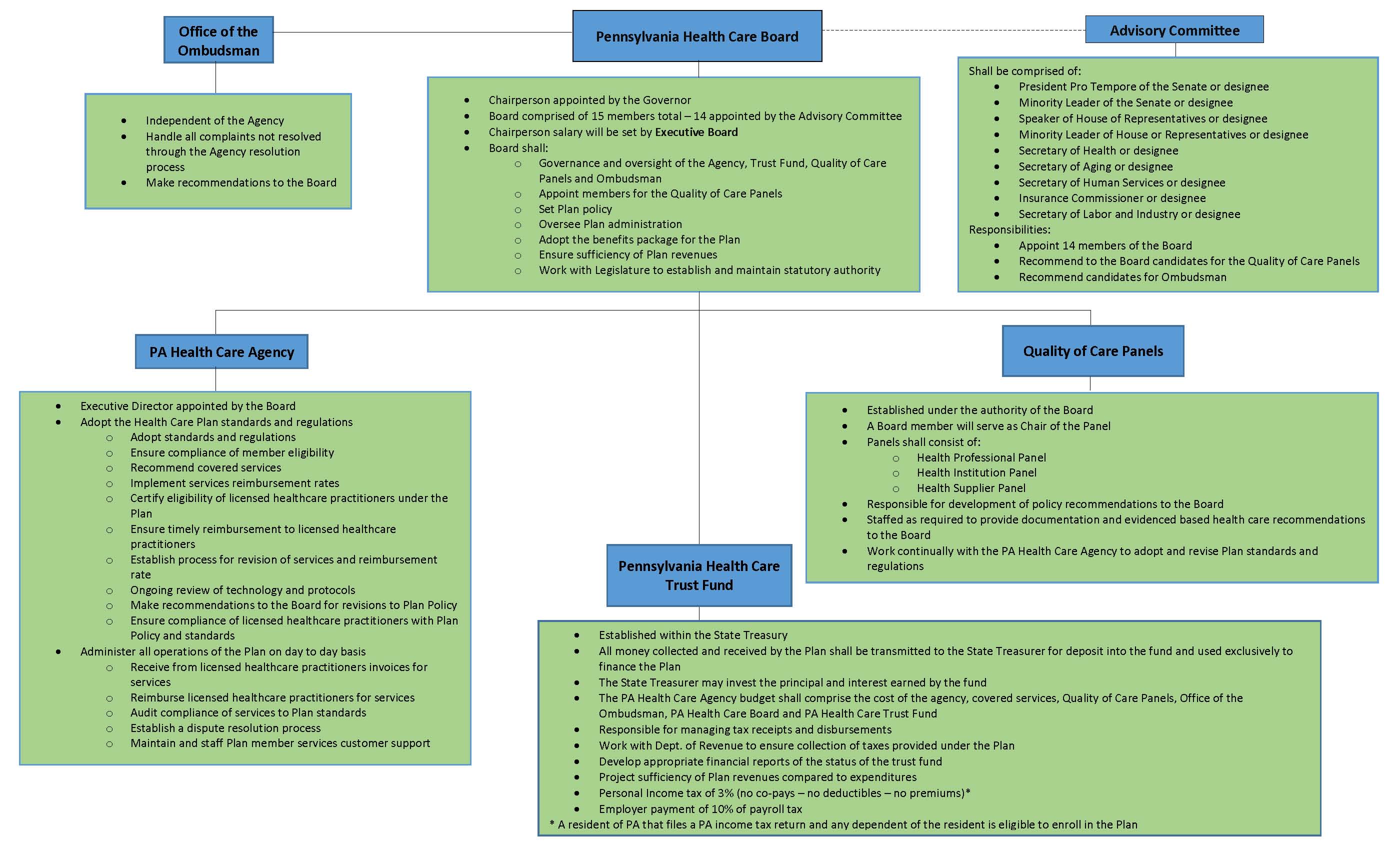 The Pennsylvania Health Care Trust Fund will be funded by a 10% employer tax paid on payroll and a 3% personal income tax.